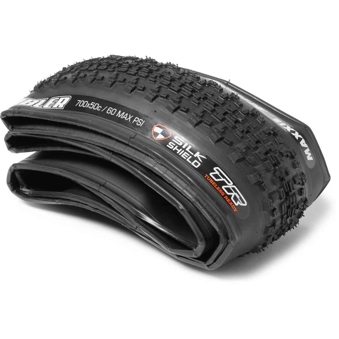 A road tire made for rugged surfaces, the Maxxis Rambler F60 DC SilkShield TR tire has tightly packed center knobs that roll over hard roads plus spaced-out side knobs that boost control on gravel.