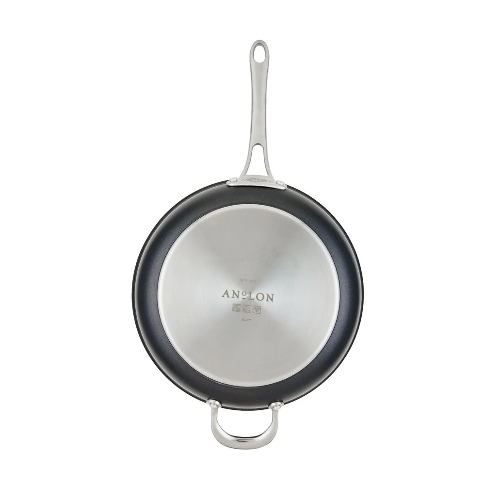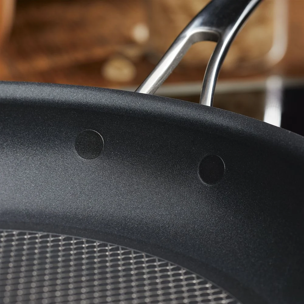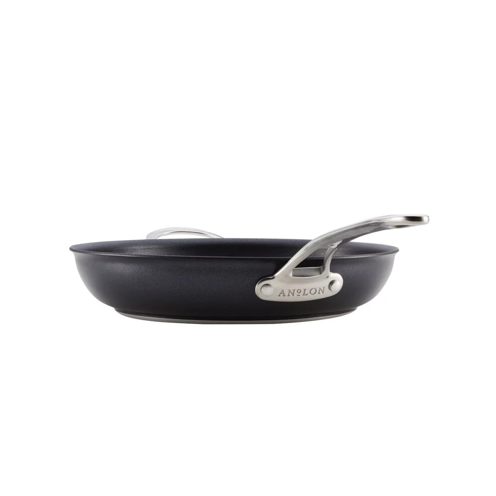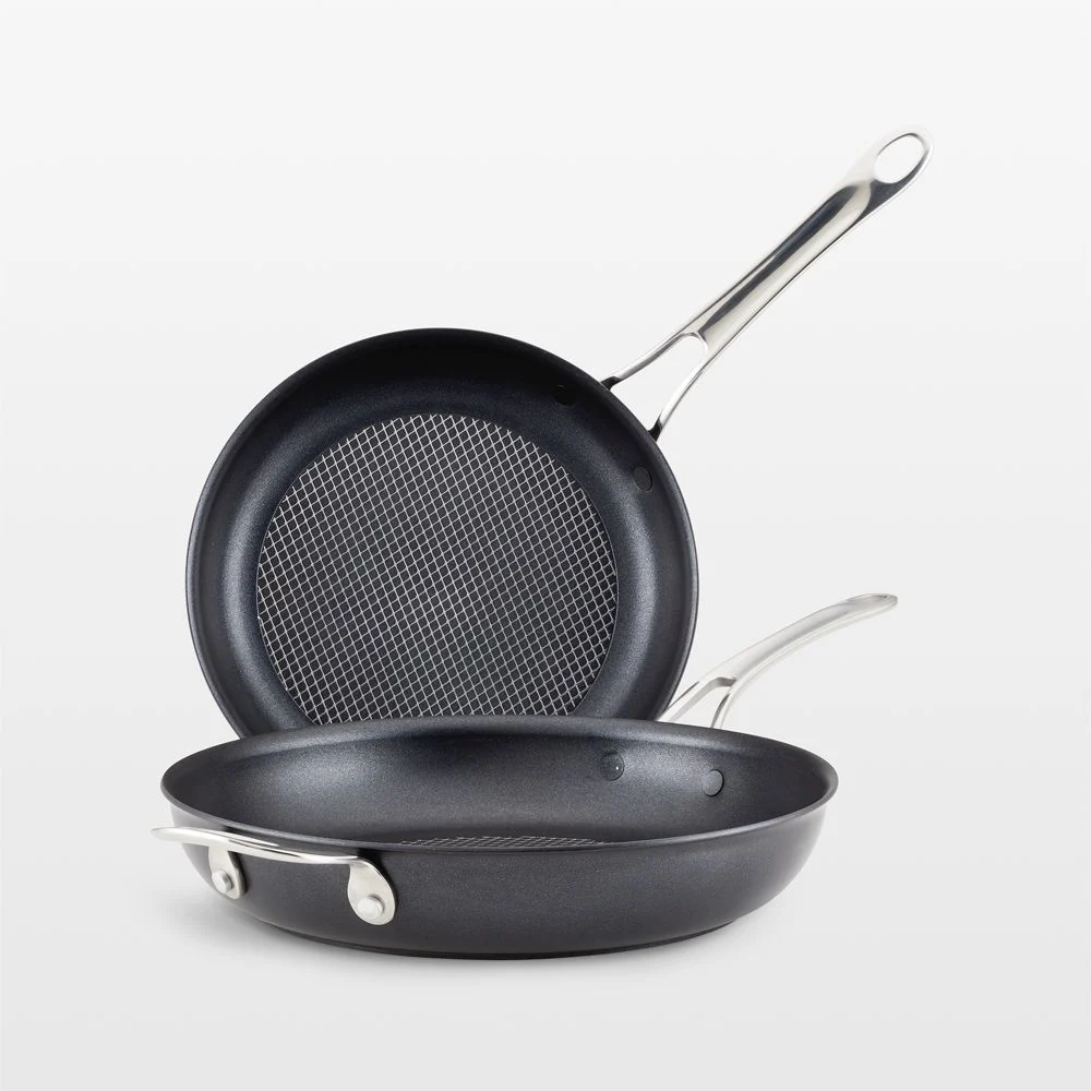 These unique frying pans feature cooking surfaces inlaid with non-stick stainless steel mesh, which sears beautifully, keeps oil in place and protects the pans from utensils. Fitted with stainless steel bases, the thick aluminum skillets ensure thorough heat conduction and retention. The oven-safe pans are suitable for use with all stoves, including induction, and clean up easily in the dishwasher. A useful housewarming, graduation or wedding gift, this two-piece set includes 10- and 12-inch fry pans.Ultra-thick aluminum pans with stainless steel bases. Stainless steel mesh cooking surfaces with AnolonX SearTech™ non-stick coating. Stay-cool polished stainless steel handles with flush rivets. Suitable for use with all cooktops, including induction. Oven-safe to 500°F. Dishwasher-safe. Set includes 10″ and 12″ fry pans. Made in Thailand.
