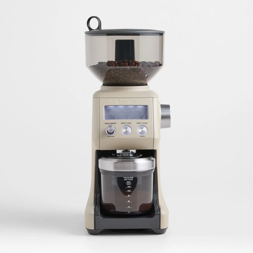 Finished in an exclusive creamy warm neutral, the Smart Grinder Pro lets you choose the grind setting, grind time and number of cups or shots required for optimal brewing whether you’re making a pot of French press coffee or a shot of espresso. The conical burr coffee grinder lets you choose from 60 grind settings and four pre-programmed options, grinding beans directly into a portafilter, airtight container, filter basket or paper filter.Brushed stainless steel, metal and plastic. Stainless steel housing and conical burrs. 18-oz. bean capacity. Dosing IQ ® technology with Precision Digital Time allows you to adjust and program grind time in 0.2-second increments for total control and a perfect dose every time. 60 grind settings plus 4 pre-programmed grind options for French press, filter, percolator or espresso brewing. Choose between shots and cups for the correct quantity of grounds. Grind directly into the portafilter or an airtight container, gold tone filter basket or paper filter (not included). LCD display. 165 watts. Includes grind container with lid and sealing cap, 2 portafilter cradles and conical burr cleaning brush. Hand wash removable parts. Imported.