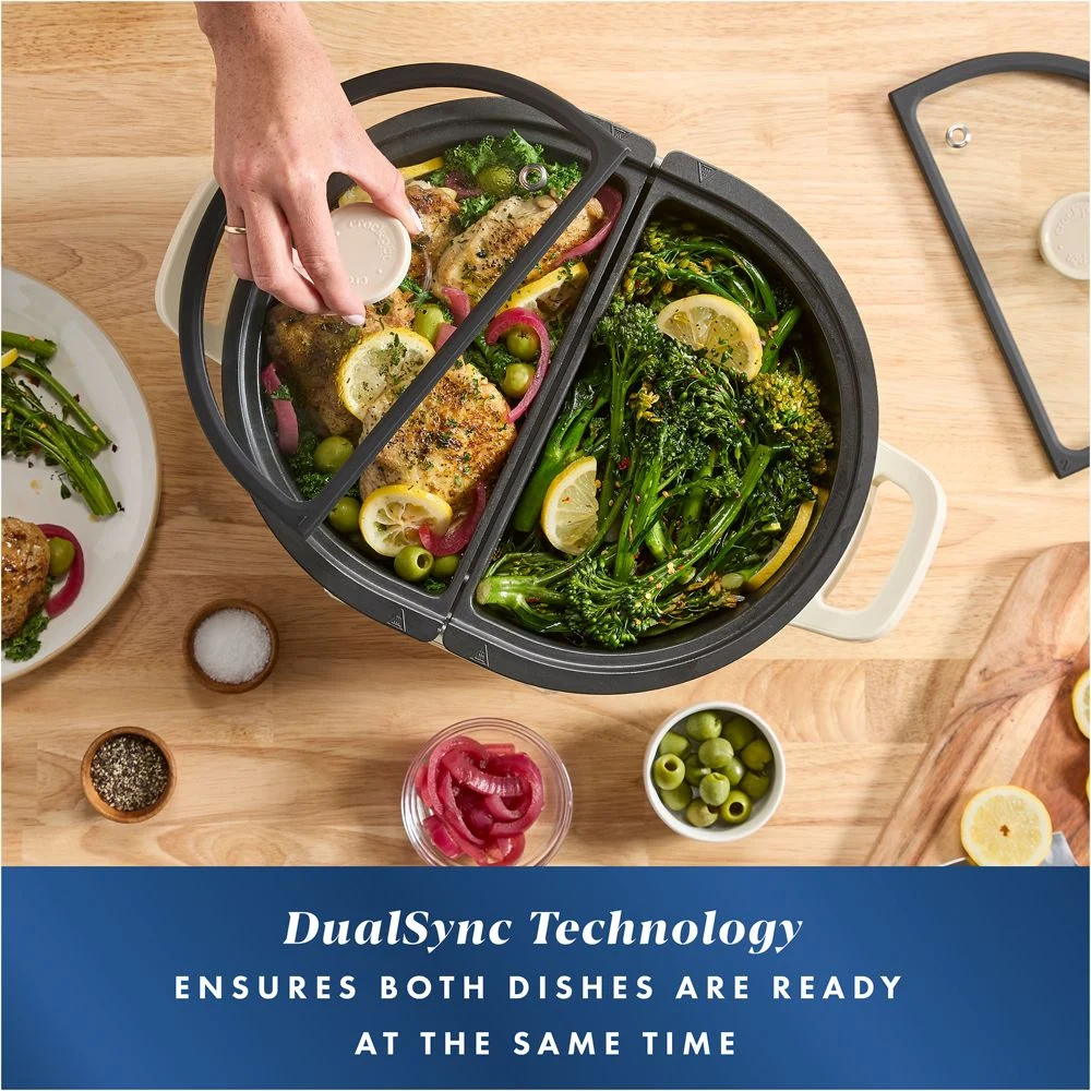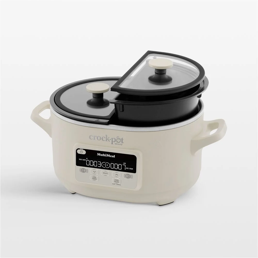 The first name in slow cookers, Crock-Pot introduces a multicooker version that can prepare two different dishes at one time. Featuring two non-stick ceramic pots, the versatile appliance uses DualSync technology with a smart timer that lets you cook with two different methods or temperatures and have them ready at the same time. Multiple cooking functions—Slow Cook, Sear/Saute, Bake, Rice/Steam and Keep Warm—lets you keep your cookware to a minimum while making it easy to expand your mealtime repertoire.Dual-pot cooking. DualSync technology uses smart timer to coordinate cooking times in both pots. Multicooker functions include Slow Cook, Sear/Saute, Bake, Rice/Steam and Keep Warm. Bake function with 300°F and 350°F options. Two 3.7-qt. nonstick ceramic pots. 2 tempered glass lids. LED display. 1500 watts. Stainless steel and plastic heating base. Pots are oven-safe up to 450°F. Lid, pots and steam rack are dishwasher-safe; hand washing recommended for pots. Imported.