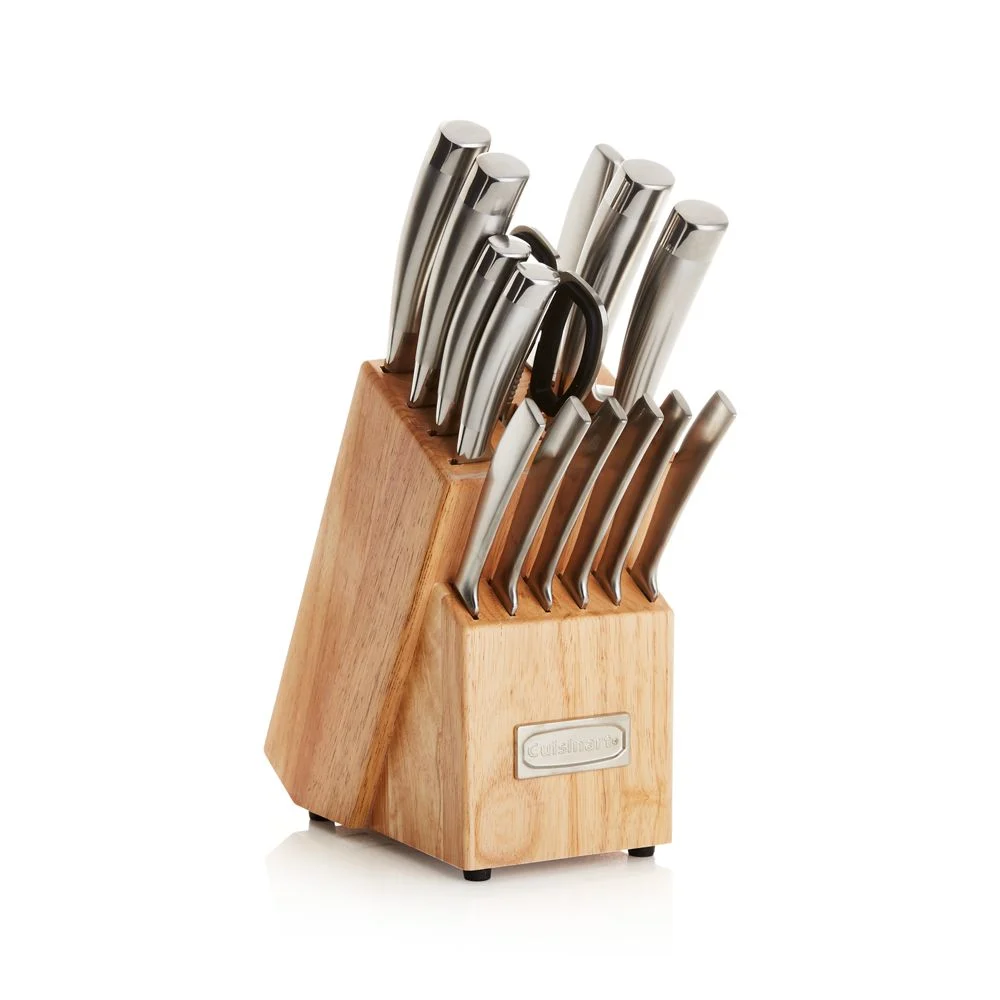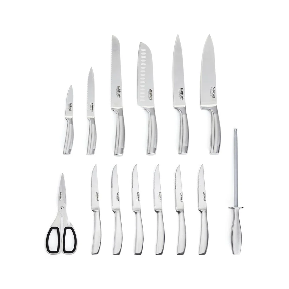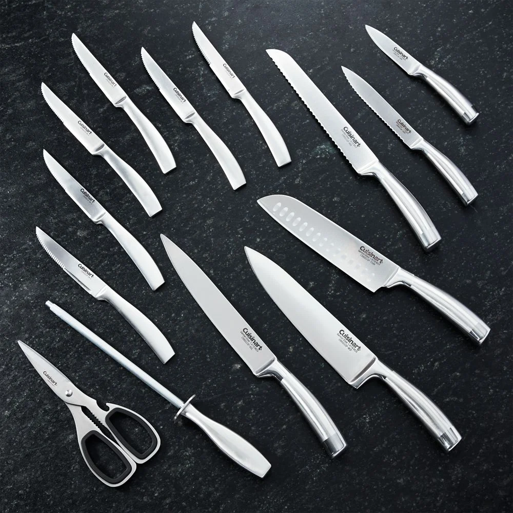 Cuisinart introduces the sharpest knives in their class, assembled in a set of 15 to take on almost every kitchen task. With an emphasis on technique, craftmanship and german steel, these professional series knives use an innovative grinding process to create a more durable, finer-edged blade. Set includes: 8″ chef, 8″ slicer, 8″ bread, 7″ santoku, 5.5″ utility, 3.5″ paring, and six 4.5″ steak knives; shears, sharpening steel and hardwood block. Need help choosing? Here’s your essential guide to choosing the best knife. View all Cuisinart. Stainless steel. V-edge for more precise cutting. Hardwood knife block. Hand wash. Imported.