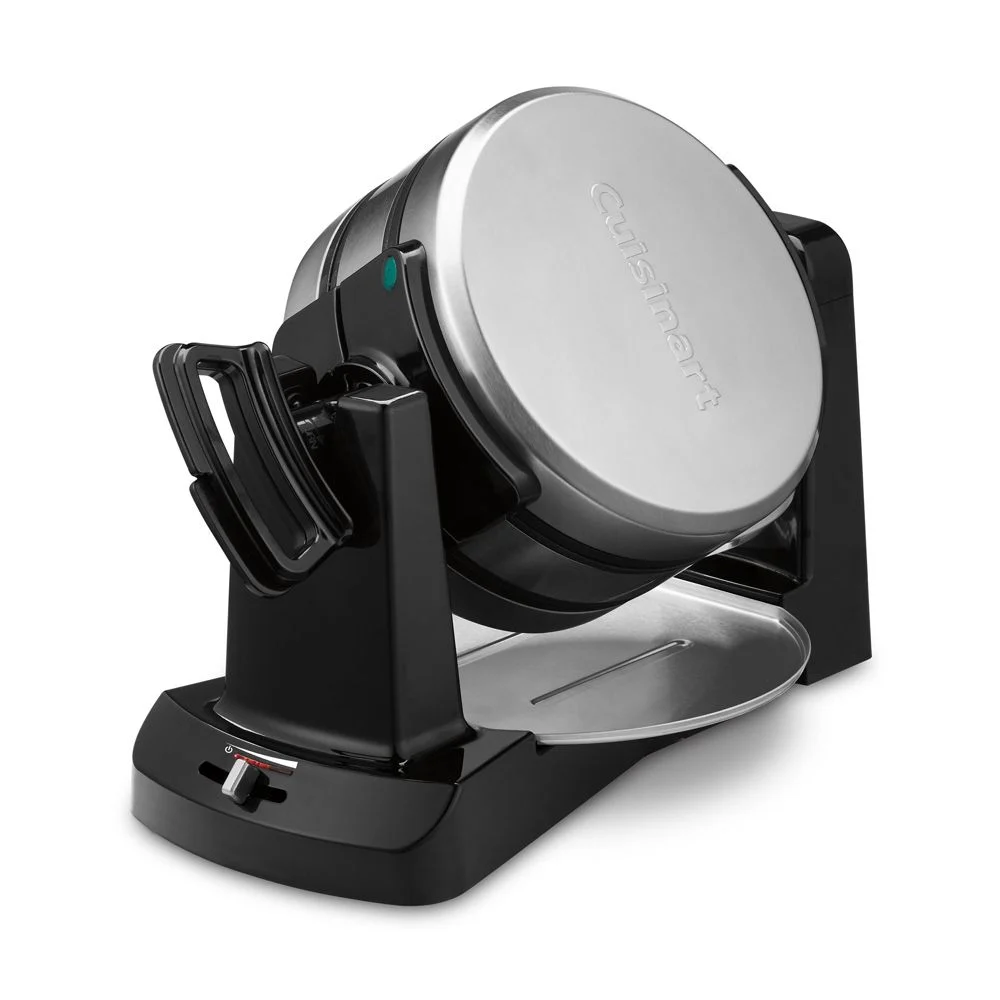 Deep-pocketed to hold more toppings, one-inch-thick Belgian waffles bake up to customized perfection in this high-performance waffle maker with five-setting browning controls. Thanks to the 180° rotary feature, waffles cook evenly top and bottom, inside and out. The double waffle iron has brushed stainless lid housing, non-stick griddle plates and indicator lights to let you know when the maker is ready-to-bake and when your waffles are done.Cuisinart has been creating inventive and accessible kitchen appliances, cookware and accessories for nearly 50 years.Brushed stainless steel and plastic. Ceramic non-stick coating. 5-setting browning control. Easy-to-Handle rotary feature flips 180°. Bakes two 1″-thick waffles. Ready-to-bake and ready-to-eat green indicator lights. Audible alert. Includes measurement cup for scooping batter. 1,400 watts. Dishwasher-safe drip tray; wipe exterior clean. Imported.