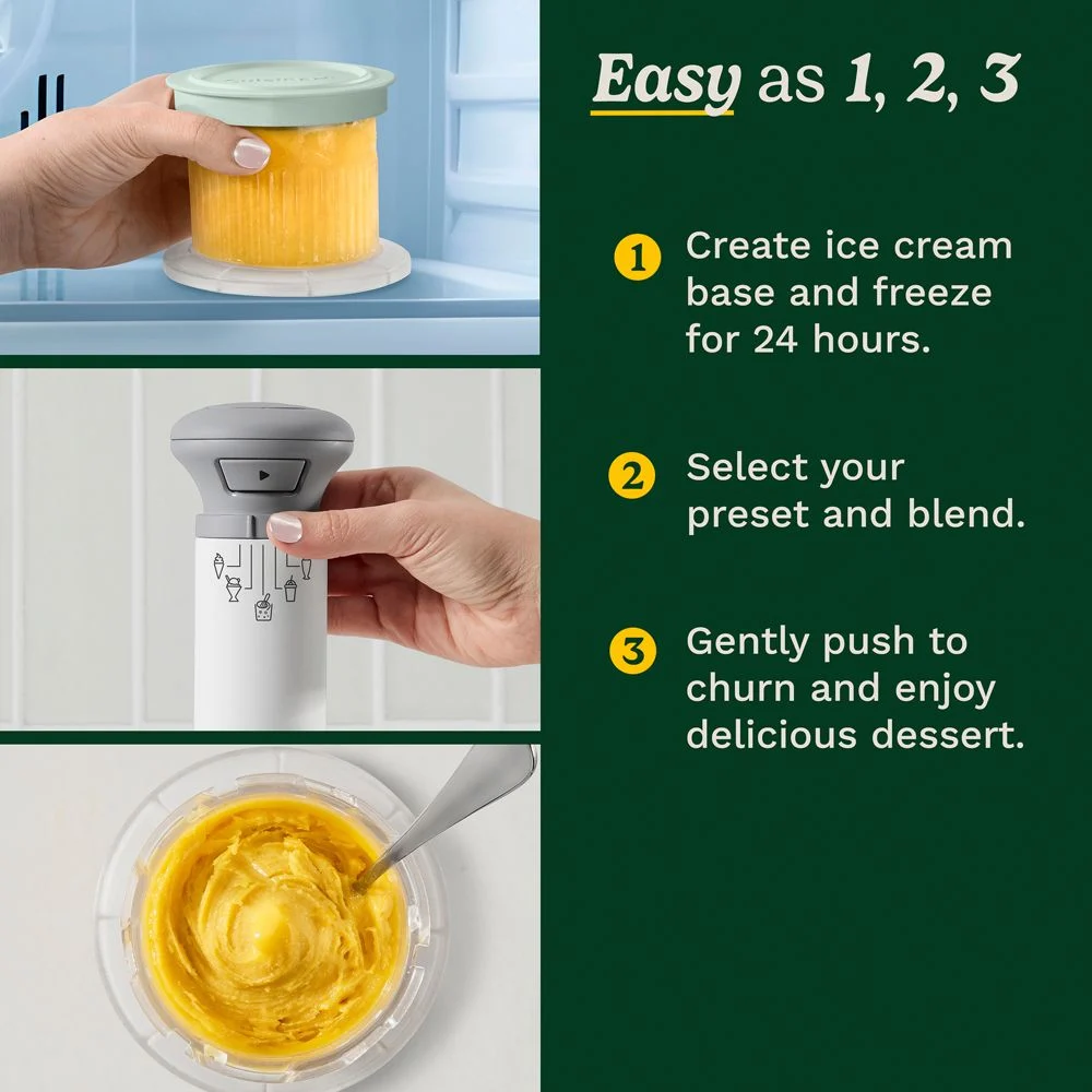 Turn juice, dairy or custard blends into a half pint of creamy, cold goodness with this handy gadget. Simply fill one of the three half-pint containers with ingredients, freeze for 24 hours, attach to the blender assembly, and choose from five preset options—Ice Cream, Milkshake, Slushie, Sorbet and Mix In. With the press of a button, you’ll have a cup of your favorite frozen treat in three minutes to enjoy right away or freeze for later.Cuisinart has been creating inventive and accessible kitchen appliances, cookware and accessories for over 50 years.5 preset programs: Ice Cream, Milkshake, Slushie, Sorbet and Mix-In. Stainless steel blade. Three 8-oz. plastic cups with lids. Plastic construction. 60″ white cord. 250 watts. Cups are top-rack dishwasher-safe. Hand wash blender assembly; do not immerse in water. Imported.
