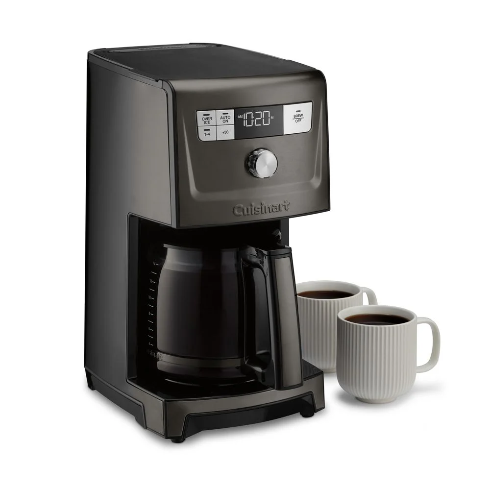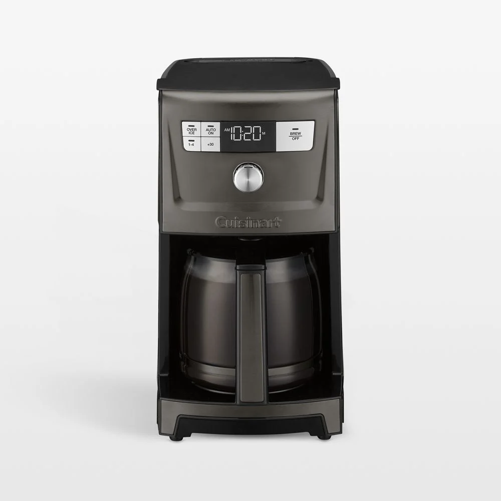 Understated in black stainless steel, this 14-cup programmable drip coffee maker with timer provides hotter coffee, faster—without sacrificing taste. Or choose the Over-Ice function to brew strong, flavorful iced coffee. The brew-pause option lets you pour a quick cup mid-brew, and the warming plate holds coffee at precisely your preferred temperature for up to four hours.Cuisinart has been creating inventive and accessible kitchen appliances, cookware and accessories for over 50 years.14-cup easy-pour glass carafe. Over-Ice function adjusts brew process to maximize coffee flavor. 1–4 cup settings. Adjustable keep-warm temperature. Keeps coffee at selected temperature for up to 4 hours. Brew pause function allows coffee to be poured midway through brewing process without mess. Auto shut-off, programmable up to 4 hours. 24-hour programmable brewing. Charcoal water filter and gold-tone permanent filter included. Integrated cord storage. Optional ready-alert tone. 60-second reset recalls settings and point in brewing process in case of power loss. Decalcify alert. Self-clean function. Stainless steel, glass and plastic construction. All removable parts are top-rack dishwasher-safe. Clean base with a damp cloth. Imported.