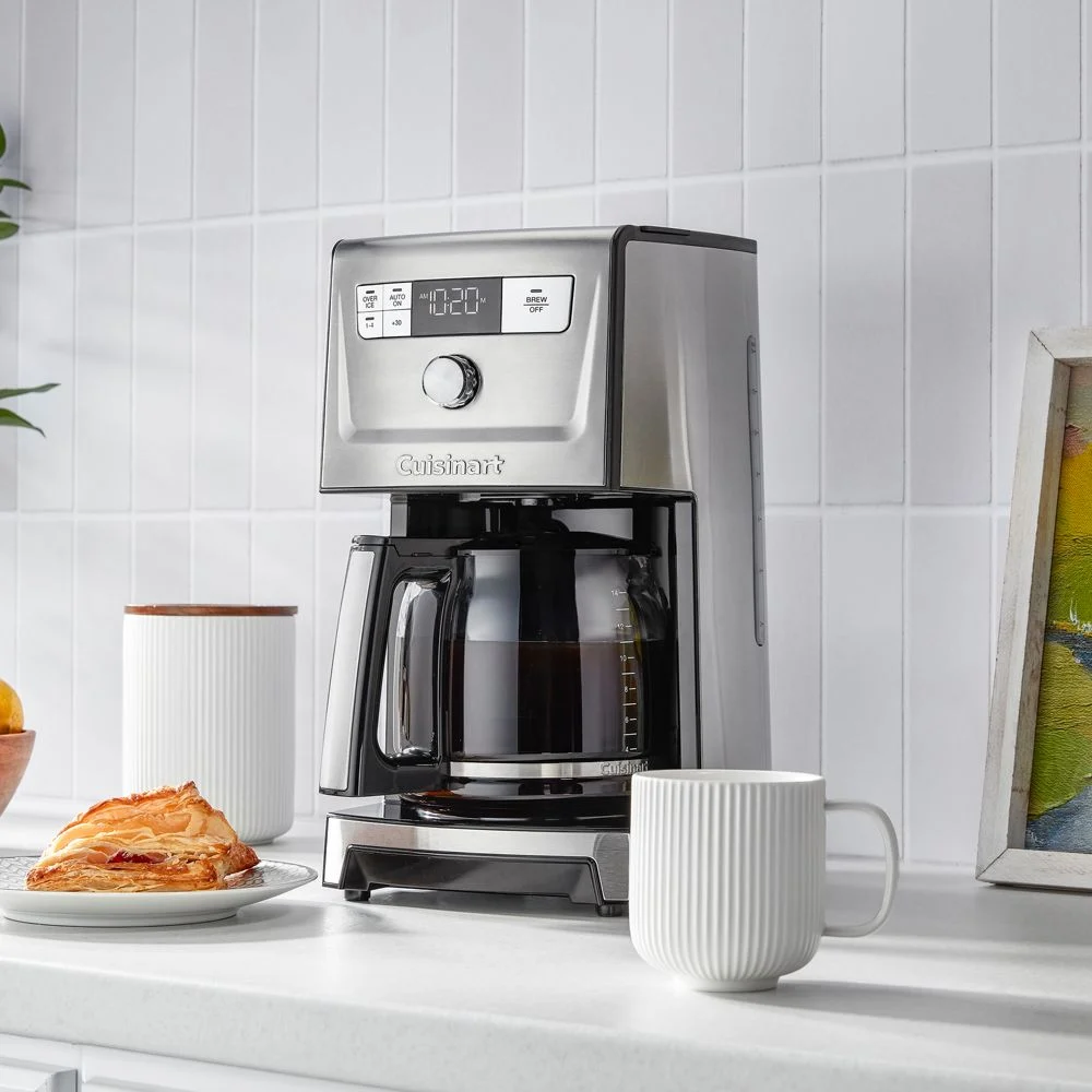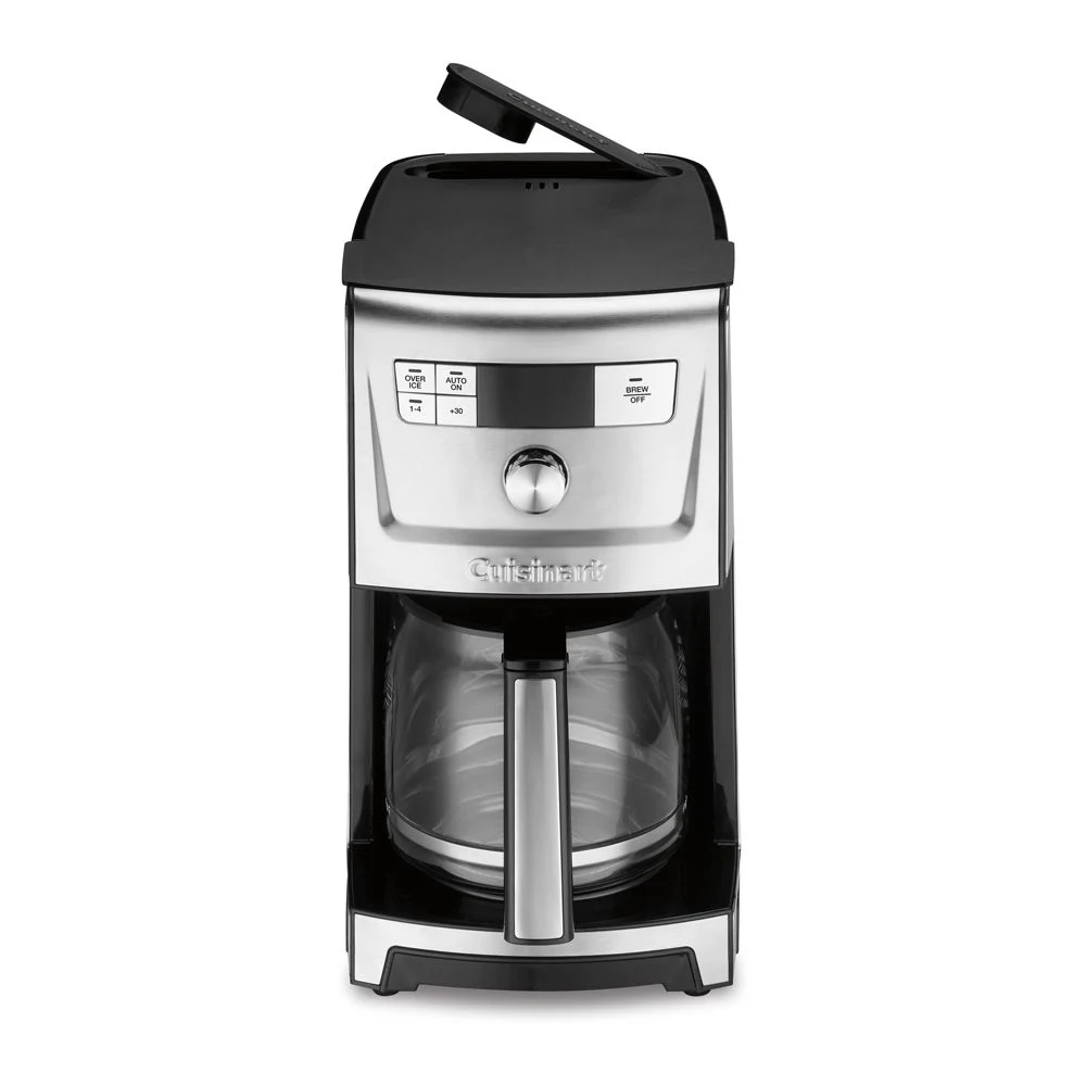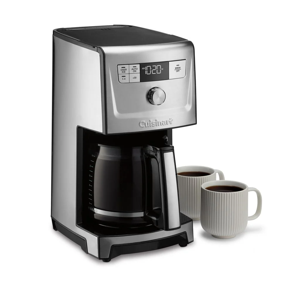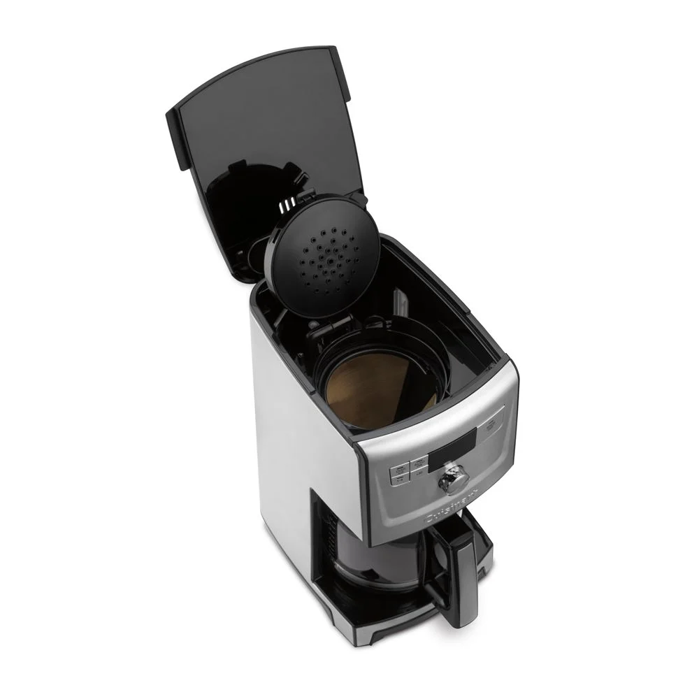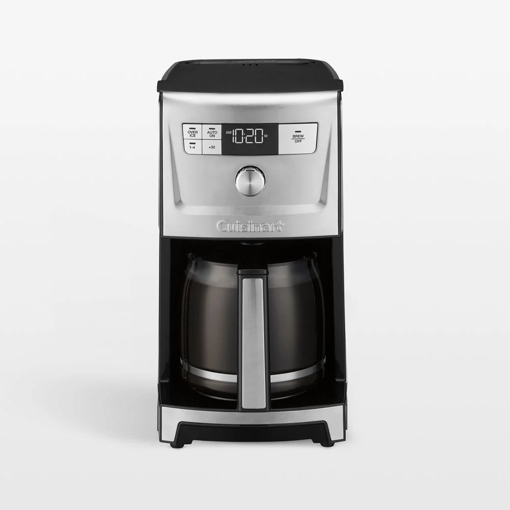 Understated in stainless steel, this 14-cup programmable drip coffee maker with timer provides hotter coffee, faster—without sacrificing taste. Or choose the Over-Ice function to brew strong, flavorful iced coffee. The brew-pause option lets you pour a quick cup mid-brew, and the warming plate holds coffee at precisely your preferred temperature for up to four hours.Cuisinart has been creating inventive and accessible kitchen appliances, cookware and accessories for over 50 years.14-cup easy-pour glass carafe. Over-Ice function adjusts brew process to maximize coffee flavor. 1–4 cup settings. Adjustable keep-warm temperature. Keeps coffee at selected temperature for up to 4 hours. Brew pause function allows coffee to be poured midway through brewing process without mess. Auto shut-off, programmable up to 4 hours. 24-hour programmable brewing. Charcoal water filter and gold-tone permanent filter included. Integrated cord storage. Optional ready-alert tone. 60-second reset recalls settings and point in brewing process in case of power loss. Decalcify alert. Self-clean function. Stainless steel, glass and plastic construction. All removable parts are top-rack dishwasher-safe. Clean base with a damp cloth. Imported.
