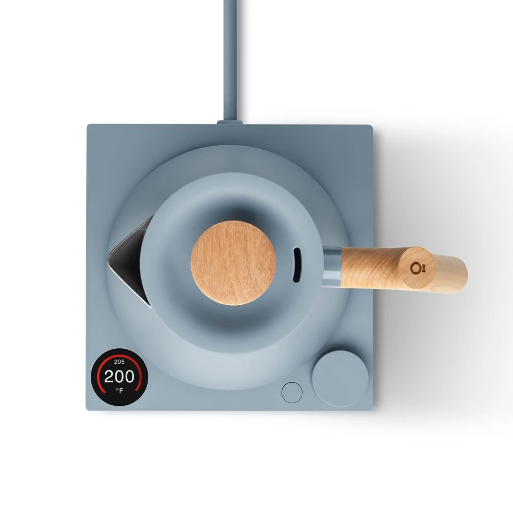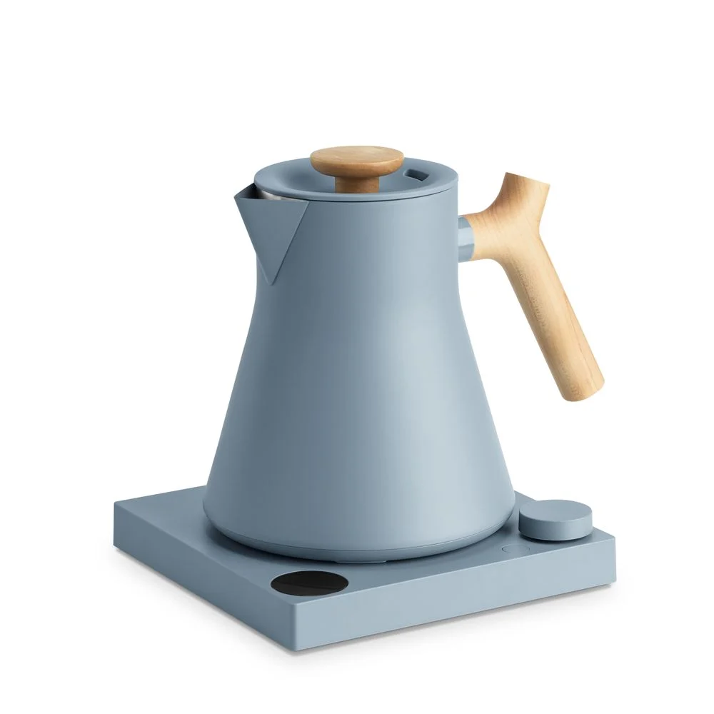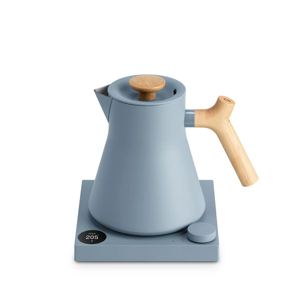 A state-of-the-art electric kettle for the modern kitchen. Sky blue stainless steel is accented with a maple handle and knob and understated, elegant controls for timeless style and impeccable function. With a nearly one-liter capacity, this sculptural and beautifully balanced kettle has simple yet precise operations. Dial in your preferred temperature for tea, French press, pour-over coffee or tisanes using the simple knob, or rely on the Guide mode to heat water optimally for your chosen brewing method. Once water is warmed, the heat shuts off automatically. Or use the Hold mode to maintain your desired temperature for up to 60 minutes. A stopwatch counts down the time for brewing coffee or steeping tea, and an optional chime provides a pleasant alert when your drink is ready.Maple handle and knob. Schedule kettle to reach specific temperature at a specific time. Guide mode heats water to correct temperature based on brewing style or type of tea. Pre-boil function sanitizes water before heating. Customizable altitude. Set precise temperature 104°F to 212°F using simple dial. Celsius and Fahrenheit options. Adjustable Hold mode maintains desired temperature for 15, 30, 45 or 60 minutes. Brew Stopwatch feature times coffee brewing or tea steeping. Optional chime alert with adjustable volume. High-resolution full-color LCD screen. WiFi connectivity: get firmware updates through WiFi using the Fellow Updater app. 3 language options: English, Spanish and French. Clock with digital and analog options. 0.9-L/30-oz. capacity. Wide-neck spout. Ergonomic counterbalanced handle. 2.5-ft. cord. 1,200 watts. Stainless steel, maple and plastic construction. Hand wash interior of kettle; descale as needed; do not submerge. Wipe exterior clean with damp cloth. Imported.