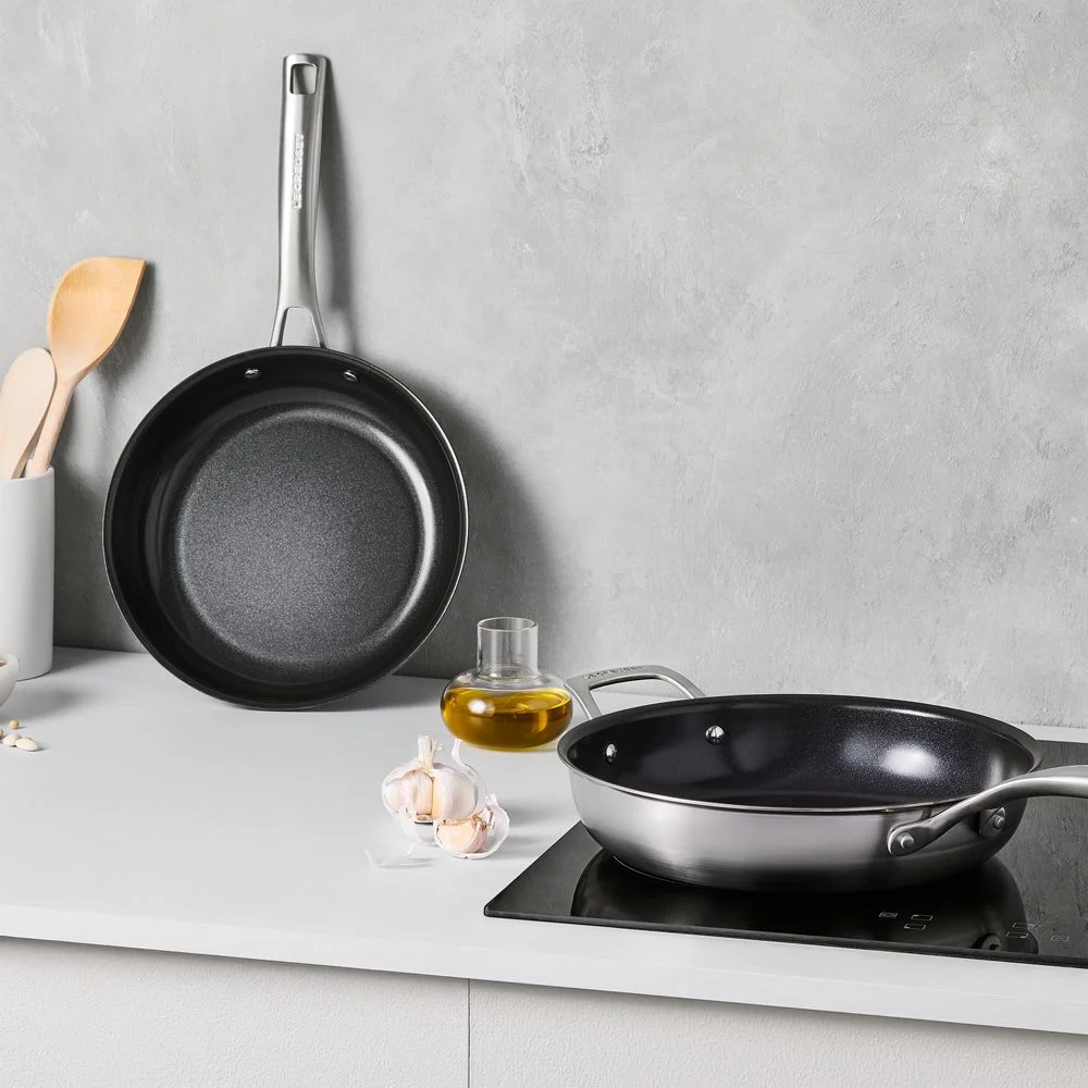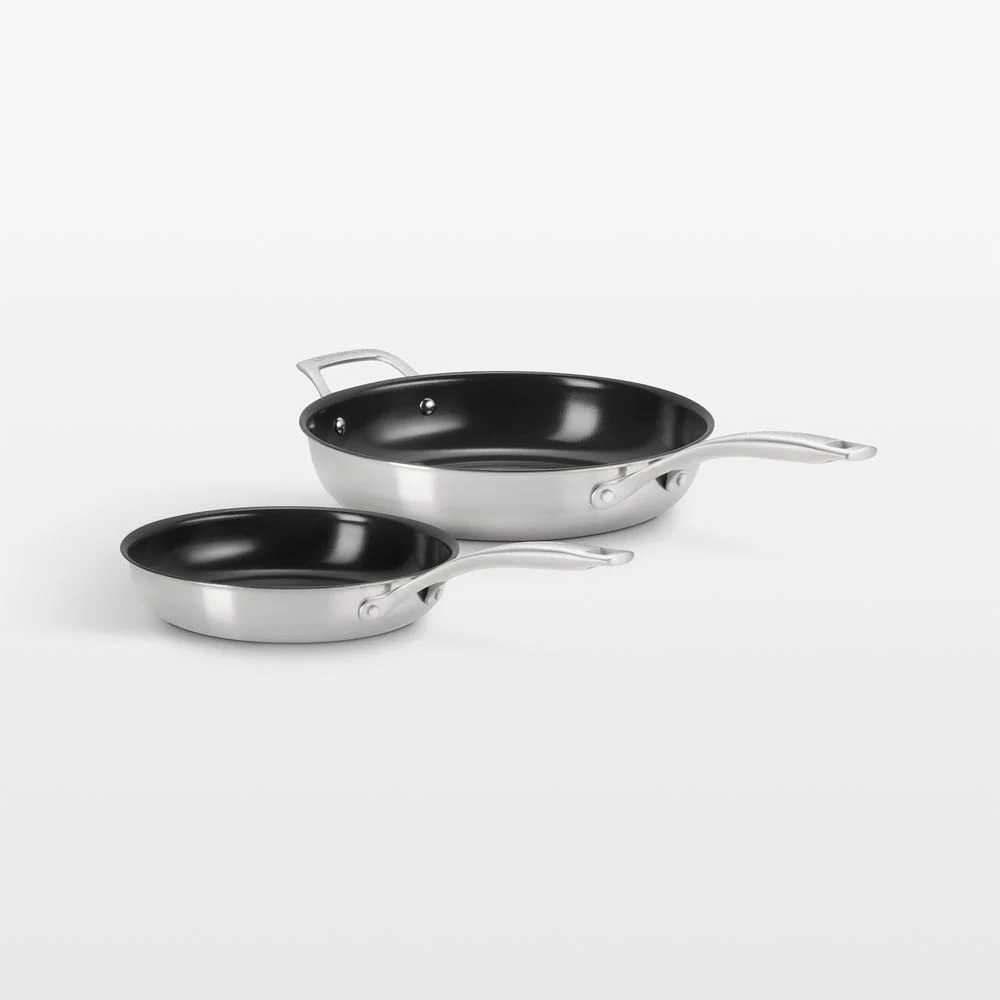 New essential cookware from Le Creuset. Crafted with a focus on hardworking versatility, this frying pan set excels at searing, frying and baking. Non-reactive stainless steel with a brushed finish shapes the shallow pans, while the aluminum cores ensure even heat distribution. The non-stick ceramic coating makes cooking oil optional. Fitted with comfortable, stay-cool handles, these essential 9.5- and 11-inch fry pans go from stove to oven to dishwasher for worry-free weeknight and special-occasion cooking.Non-reactive stainless steel exteriors and handles with brushed finish. Triple-reinforced ceramic non-stick coating for browning and searing with or without oil. Imported. Aluminum cores distribute heat evenly. Stay-cool ergonomic handles. Helper handle on 11″ pan. Metal utensil-safe. Suitable for use with all stovetops, including induction. Oven-safe to 500°F. Dishwasher-safe; hand washing recommended. Set: 9.5″” and 11″” fry pans. Imported.