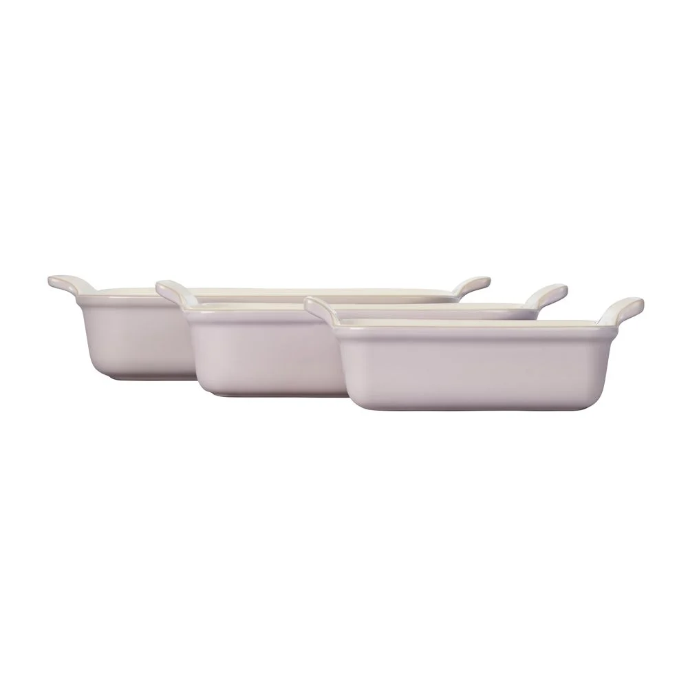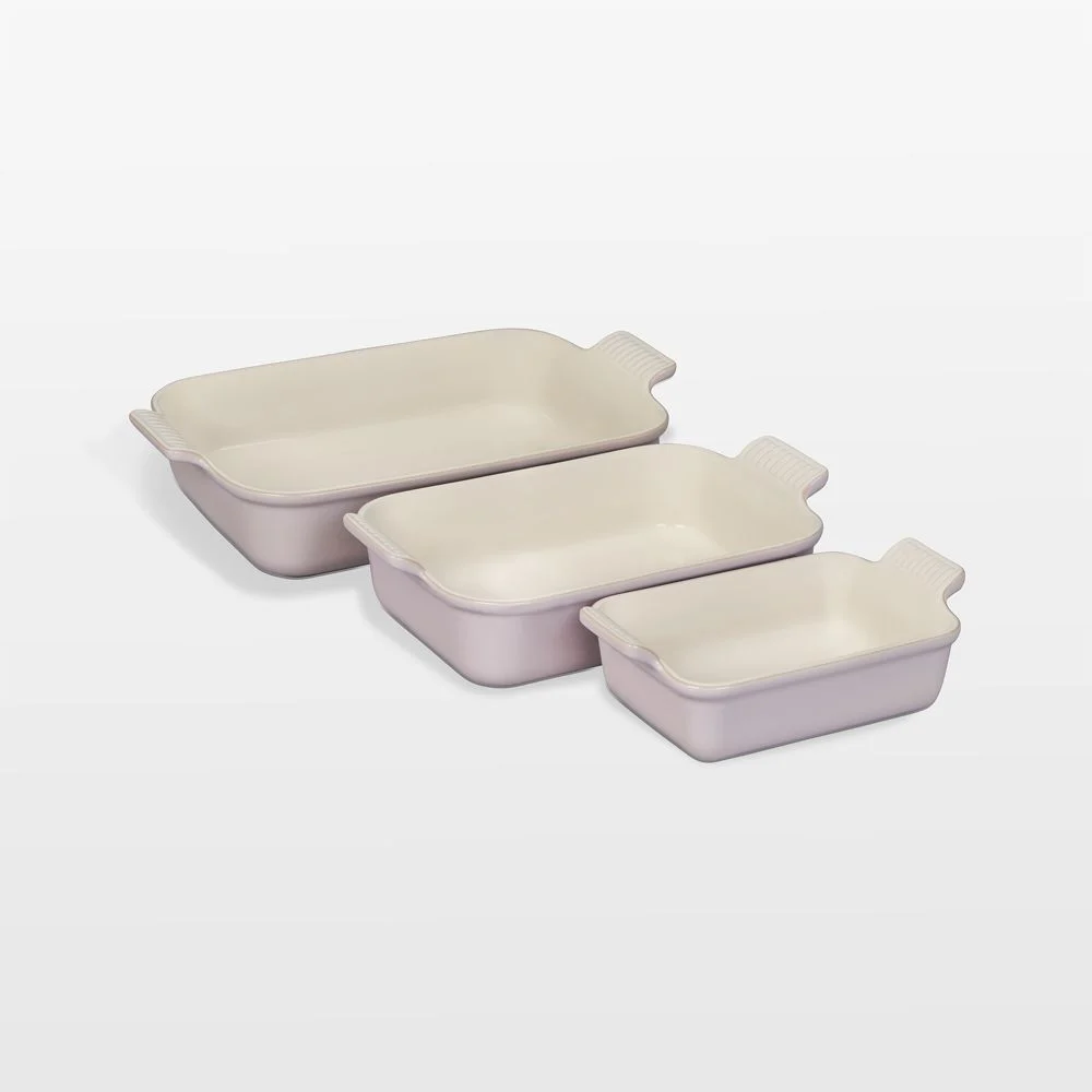 As beautiful as it is functional, the Heritage line of stoneware bakeware provides superior heat distribution and temperature retention, making it ideal for baked goods and roasted dishes. Glazed in our exclusive shade of creamy blush-purple inspired by shallots, these three dense stoneware baking dishes resist scratching, staining, cracking and crazing. Their nearly non-stick interiors effortlessly release foods and clean up easily. The rectangular bakers are helpfully sized for marinating meat, roasting root vegetables and baking bread, enchiladas and fruit crumbles. Crafted with ridged handles, the baking pans go beautifully from oven to table for a timeless presentation and nest compactly when not in use.Revered by both professional chefs and home cooks since its 1925 debut, Le Creuset’s classic cookware is prized for its utilitarian beauty and unsurpassed heat retention.Set includes: 12.5″/4-qt., 10″/2.5-qt. and 7.5″/1.1-qt. baking dishes. Glazed stoneware. Nonporous and non-reactive enamel resists scratching, cracking, crazing, staining and flavor absorption. Safe for use with metal utensils. Microwave-, freezer- and oven-safe to 500°F. Dishwasher-safe; hand washing recommended. Made in France.