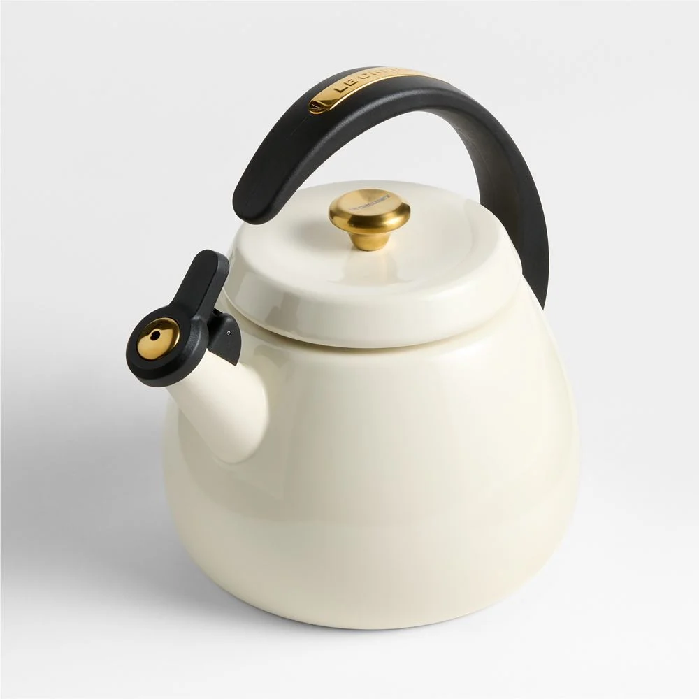Adorn your stove (and boil water, of course) with this display-worthy kettle coated in creamy enamel—a exclusive. Made of quick-heating carbon steel that works with all stovetops, the kettle announces that water has reached a rolling boil with a classic, charming whistle. The enamel resists chips and stains, and the black handle arcs dynamically for easy pouring and a comfortably cool grip. Gold-finished details give the generously sized kettle a gleaming finishing touch.Carbon steel kettle with enamel finish. Stainless steel knob and details with gold finish. Stay-cool phenolic handle. Chip- and stain-resistant. Non-reactive. Single-tone whistle. Halo-style handle for easy lifting and comfortable grip. 2.2-qt. capacity. Empty kettle between uses. Suitable for use with all stovetops, including induction. Hand wash only. Made in Thailand.