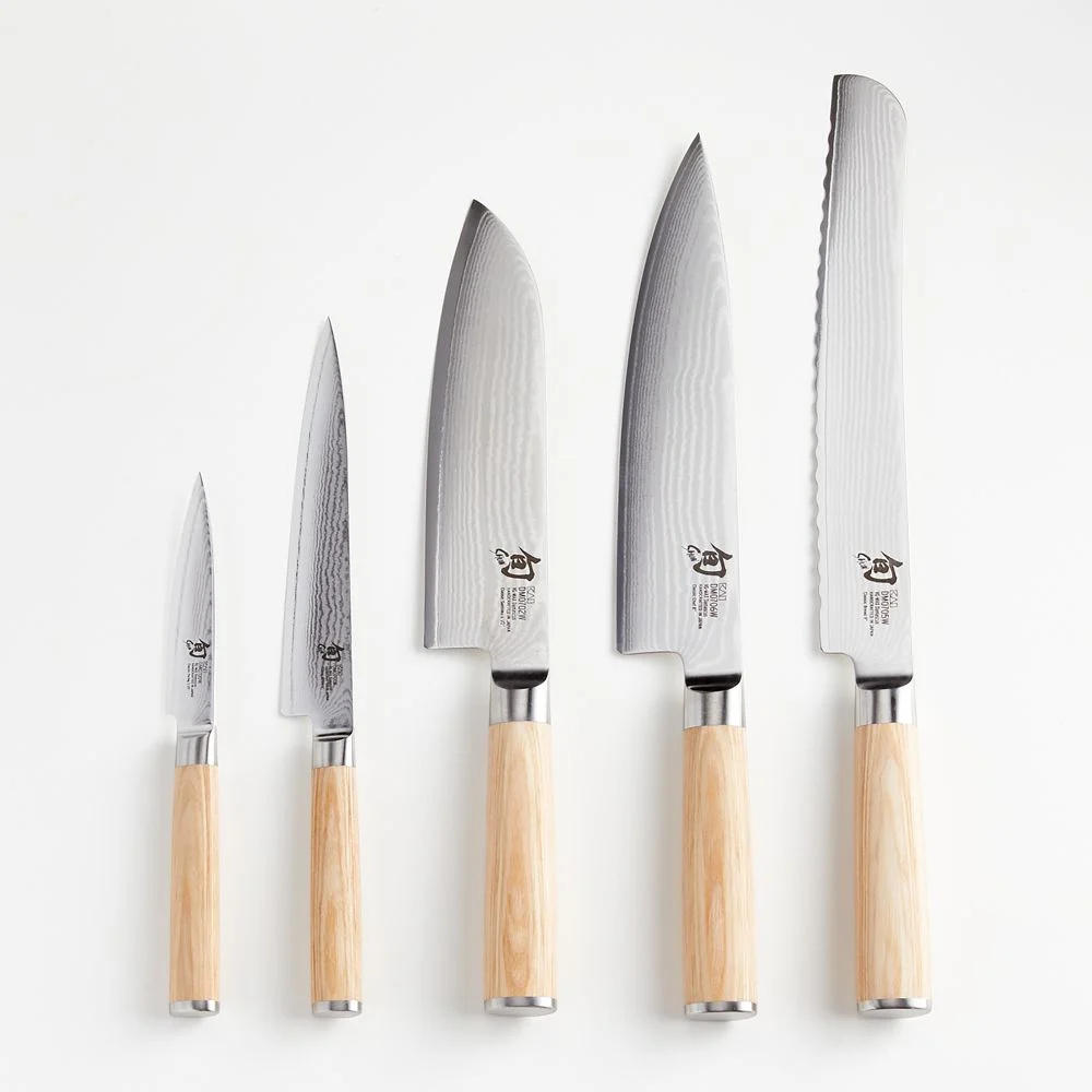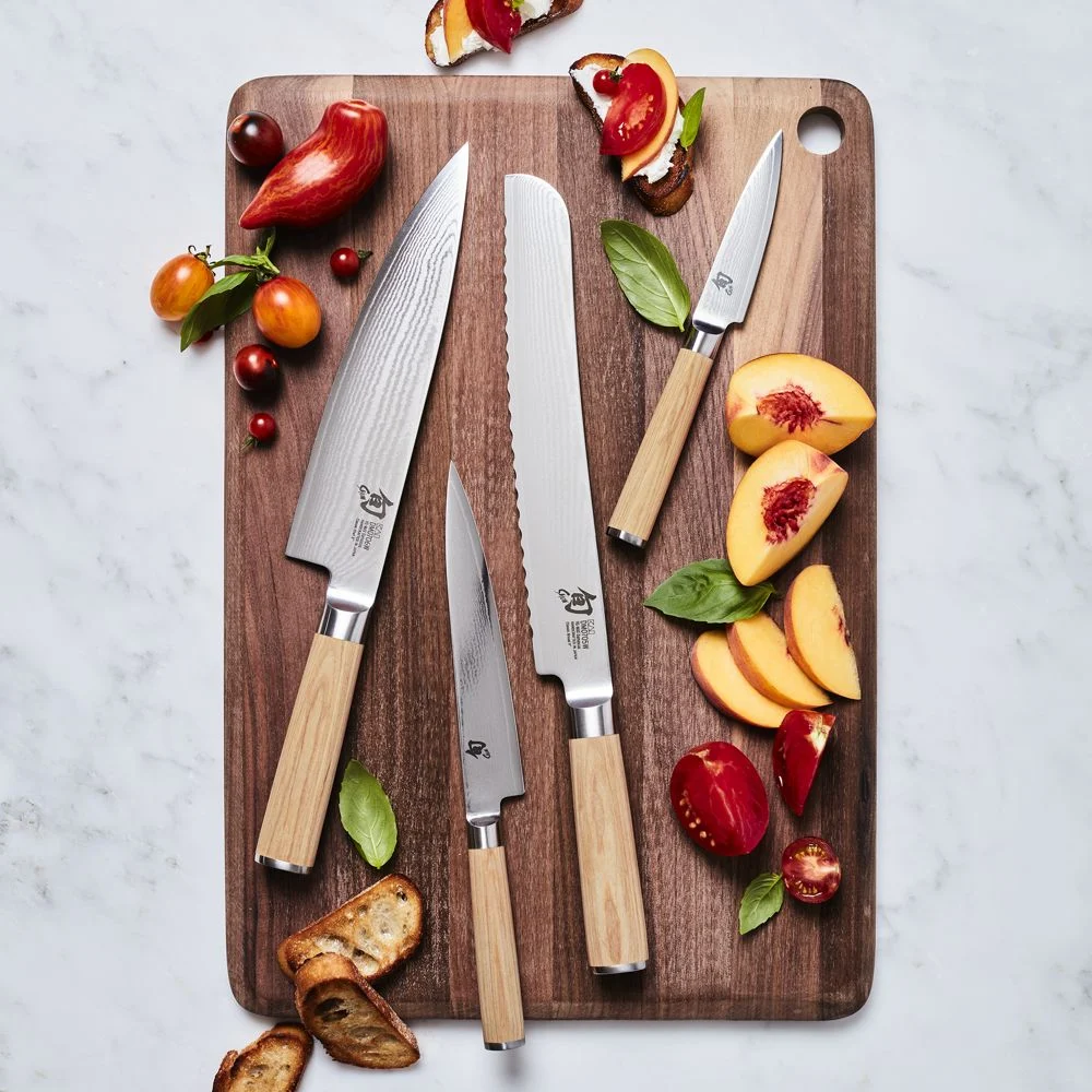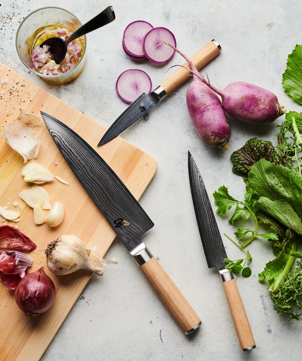 This nimble, razor-sharp utility knife with its straight, narrow blade creates precise cuts for a variety of prep tasks, and the knife’s slightly curved shape allows it to be subtly rocked to achieve a fine mince of fresh ingredients. A rippled Damascus finish is achieved by forging 34 layers of stainless steel on each side. Flexible, stick-resistant blade is hand ground to an exceptional 16-degree angle, then polished by hand. Impregnated with resin for durability, the beautiful blonde birch wood handle won’t harbor bacteria and is comfortable for left- and right-hand use.Each exquisite Shun knife is carefully crafted in a 100-step process inspired by ancient sword smiths. The amazing blades are created in Seki City, Japan’s 700-year-old center for samurai swords. Need help choosing? Here’s your essential guide to choosing the best knife. View all Shun Knives. Handcrafted. 68 total layers of stainless steel. Resin-impregnated birch PakkaWood ® handle. VG-MAX cutting core. Full composite tang. Blade has a 16°-edge angle. Rust- and stain-proof. Hand wash only. Due to Shun’s recent logo update, your cutlery’s logo may differ from the photos. Made in Japan.