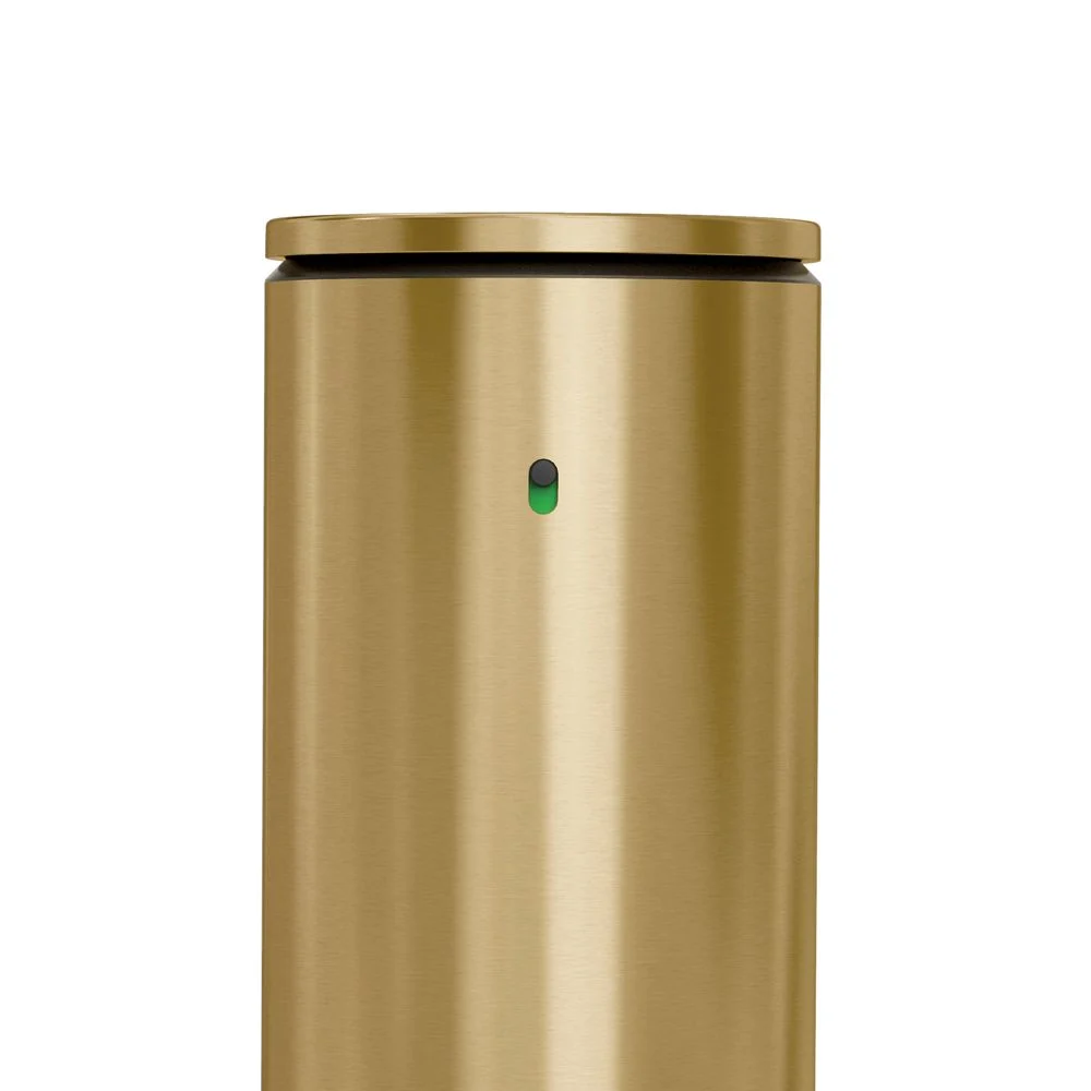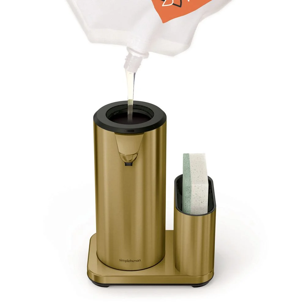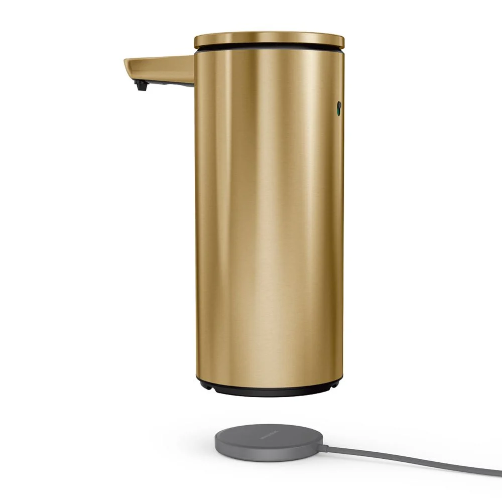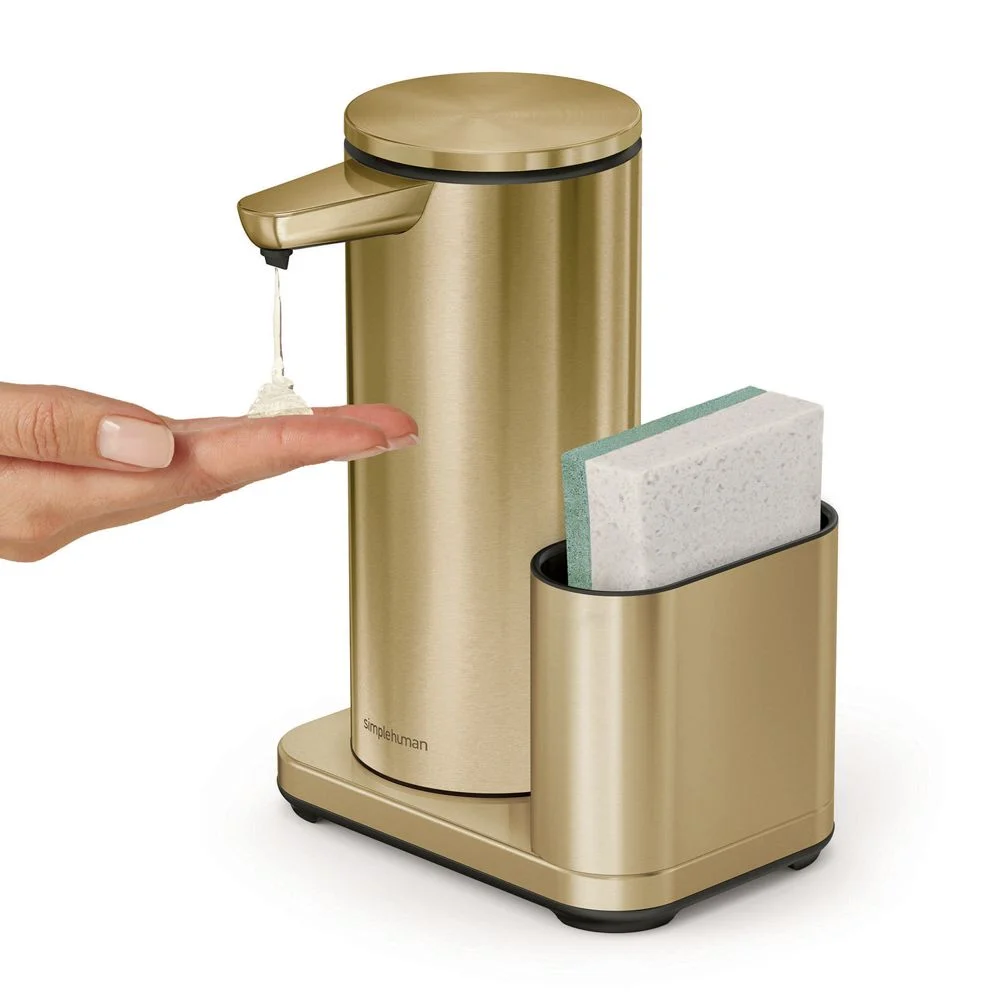 Keep your sink sleek and functional with this gleaming soap pump set. Ingenious modern engineering reinvents the soap dispenser with touch-free technology and clog-proof tubing. By moving your hand or sponge closer or farther from the spout, you can control the amount of hand soap, dish soap or hand sanitizer that’s instantly dispensed. The flexible silicone valve opens and shuts quickly for a consistent flow without messy drips, and the fully rechargeable dispenser works for up to eight months on a single charge. Glam and gilded in brass-finished stainless steel, this display-worthy set includes a caddy that corrals the soap pump and a sponge.Touch-free dispensing. Easily control amount of soap by placing hand/sponge closer for more soap or further away for less soap. Efficient, powerful pump with airtight tube dispenses soap quickly. Silicone valve prevents drips. Clog-proof tubing pump ensures precise, consistent flow. Wide opening for fast, drip-free refilling. Rechargeable: single charge lasts up to 8 months. Fully enclosed water-resistant wireless charging. QR code under lid makes it easy to reorder soap. Use simplehuman soap (not included) for optimum pump performance. Also works with hand sanitizer. Caddy accommodates sponge (not included) and soap caddy. 14-oz. capacity. Stainless steel with brass finish, plastic and silicone construction. Waterproof for easy cleaning. Turn off and rinse clean. Imported.