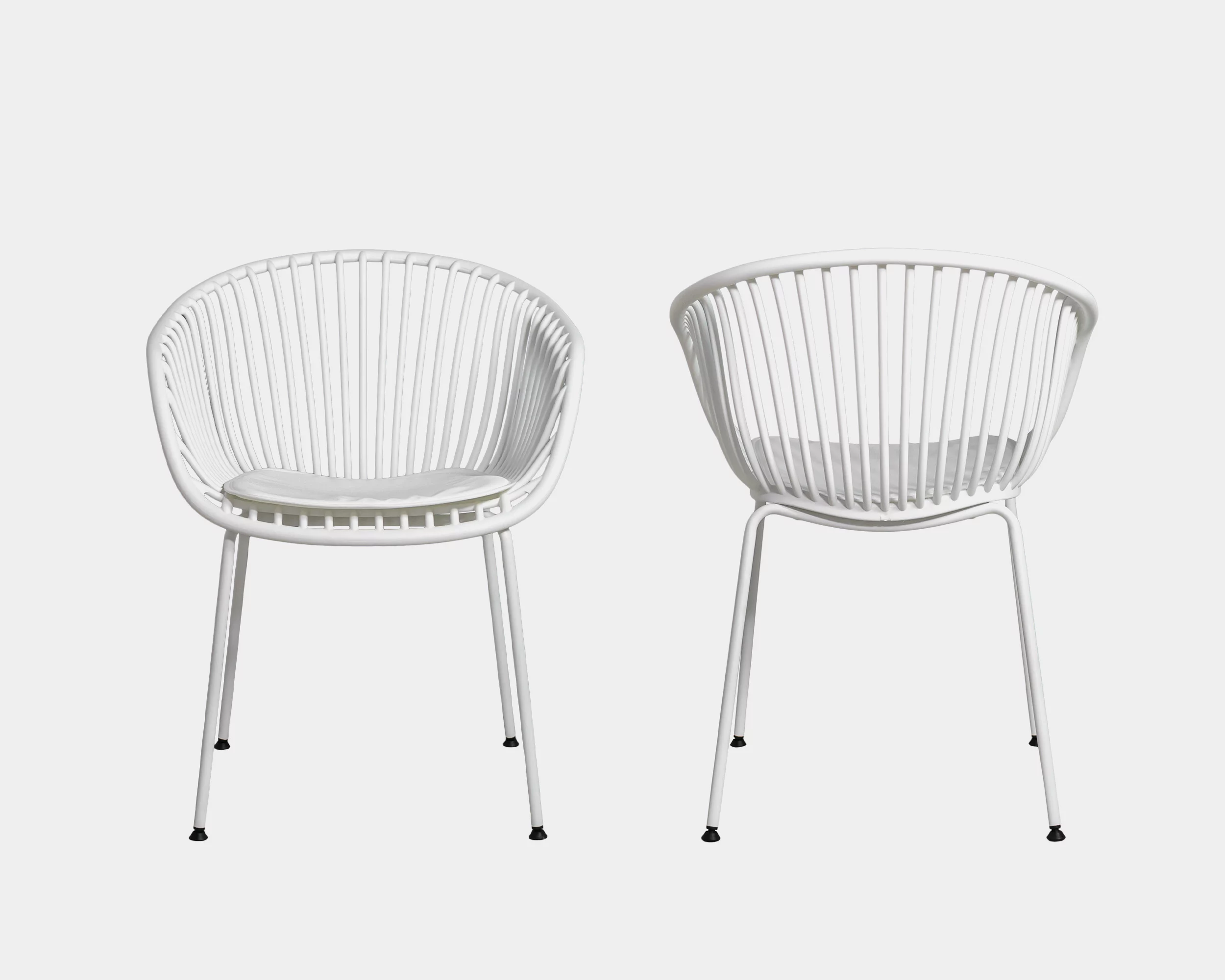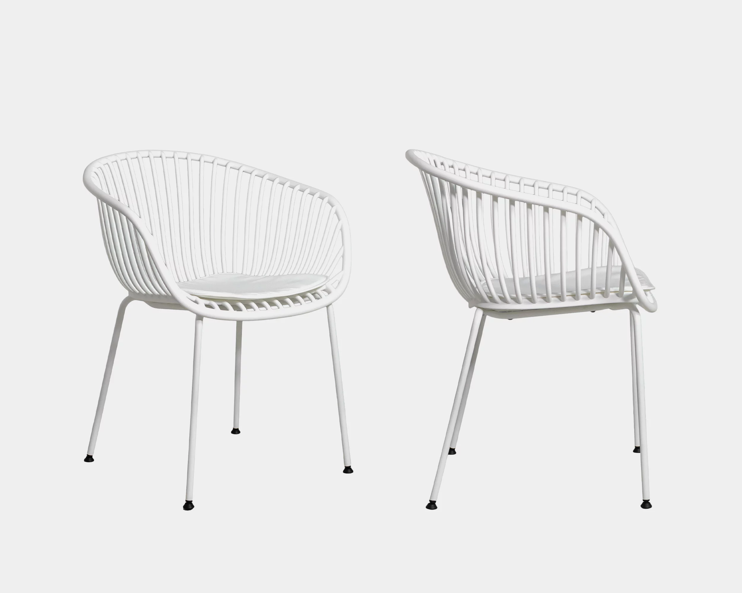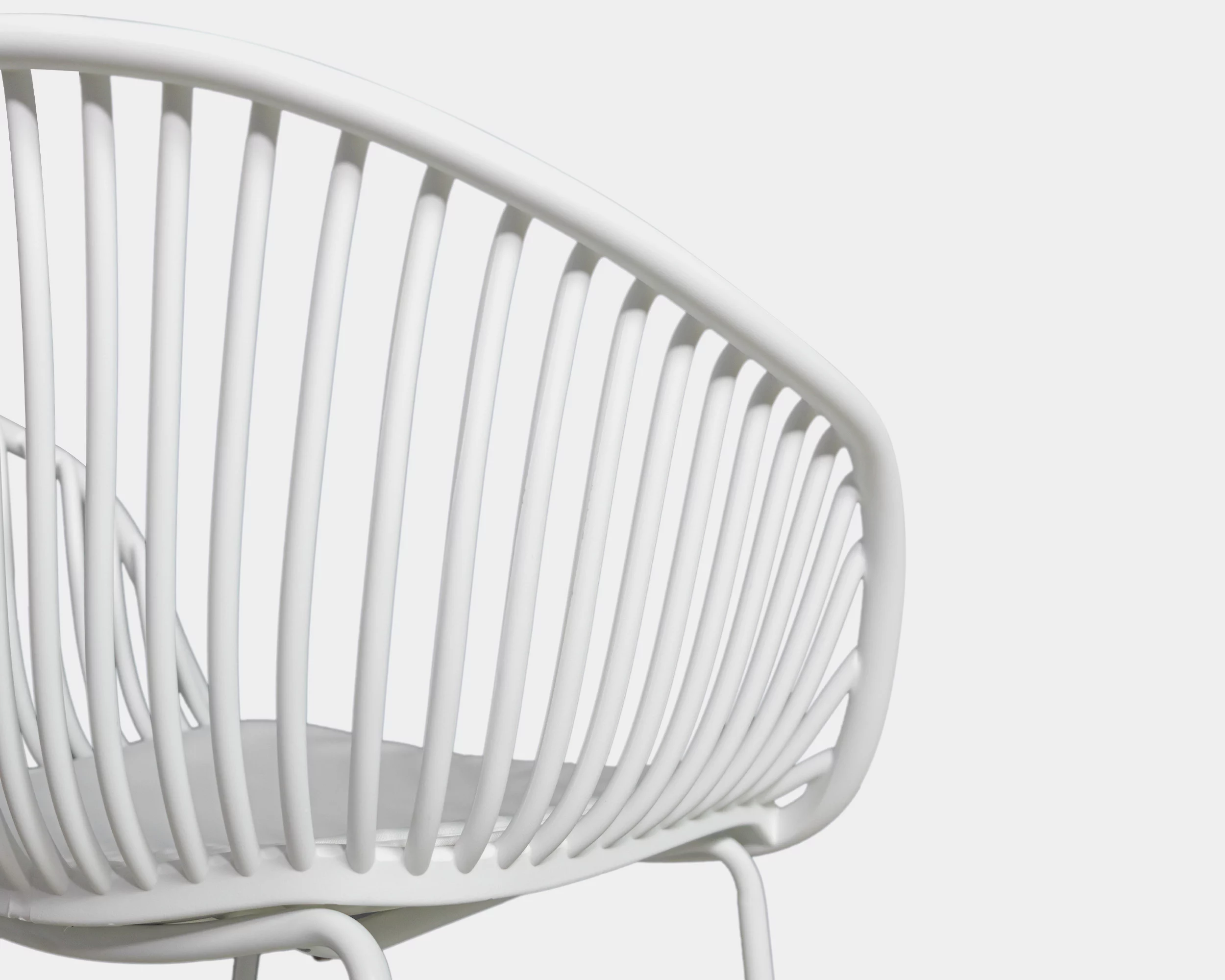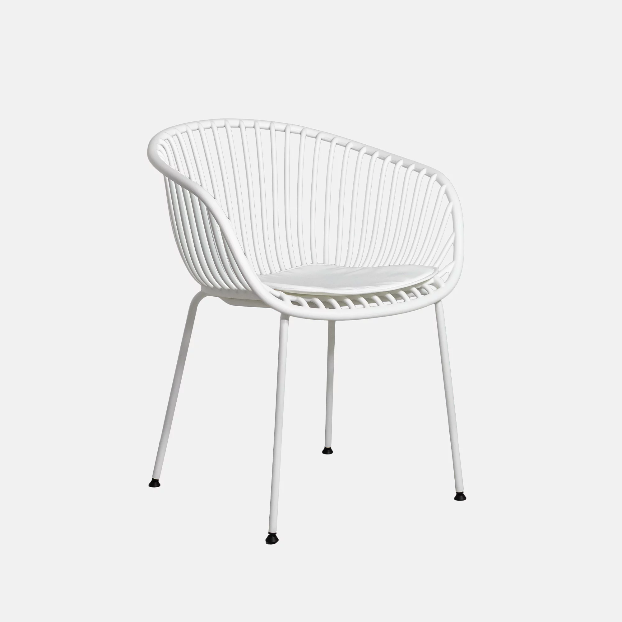 A contemporary polypropylene chair from Zapvu, featuring a sleek, open-weave design and powder-coated metal legs for added stability. Its curved back and integrated armrests provide both comfort and style, making it a versatile piece for indoor and covered outdoor spaces.