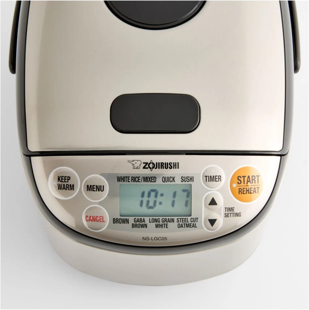 Developed in Japan by the makers of the original rice cooker, a microchip maintains perfect time and temperature to produce moist, fluffy rice time after time. Large LCD displays clock and timer functions and a menu of settings for white, sushi, brown, quick-cooking and gaba rice; as well as porridge and oatmeal. Nonstick spherical bowl conducts heat evenly to prevent overcooking. Rice cooker includes a special measure cup and nonstick rice spatula for serving.Stainless steel and plastic. Nonstick finish. Clock, timer and menu setting functions with large LCD display. Hand wash. Imported.